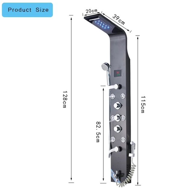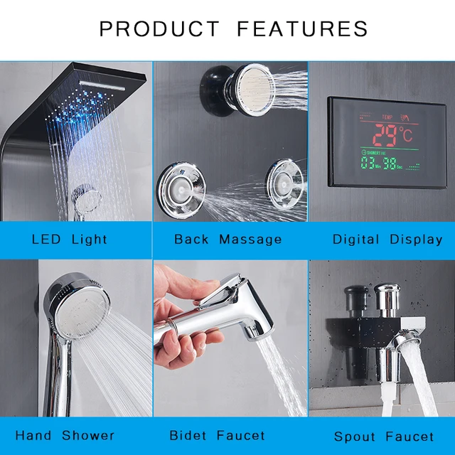 Falra Szerelhető Fekete Zuhany Panel Zuhanyoszlop Led Vízesés Csaptelep Készlet Permetező Masszázs Hőmérséklet Kijelzővel