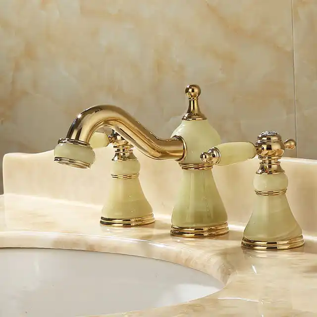 Medence Csaptelep Arany Sárgaréz Jade Fürdőszoba Kézmosó 3 Lyuk Széles Körben Keverő Dupla Forró És Hideg Vízcsap